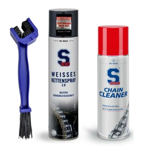 Zestaw do Pielęgnacji i Czyszczenia Łańcucha Motocyklowego: S100 Chain Lube White 400ml + S100 Chain Cleaner 300ml + Szczotka